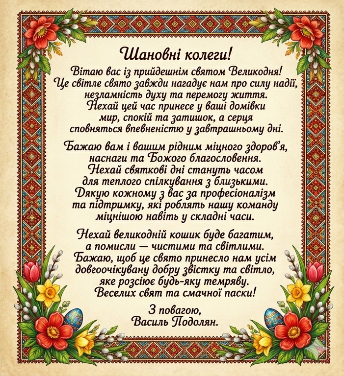 З вітальним словом виступив Василь Подолян і подякував викладачам за їх кропітку і самовіддану працю на протязі багатьох років. «Прийміть щирі вітання з нагоди Дня Працівника освіти! Це свято об'єднує всіх, хто з любов'ю і відданістю сприяє розвитку майбутніх поколінь, передає знання, формує цінності та виховує гідних громадян нашої країни. Ваша праця є неоціненною, адже саме ви допомагаєте молоді віднайти свій шлях у житті, надаєте їм крила для нових звершень та досягнень…